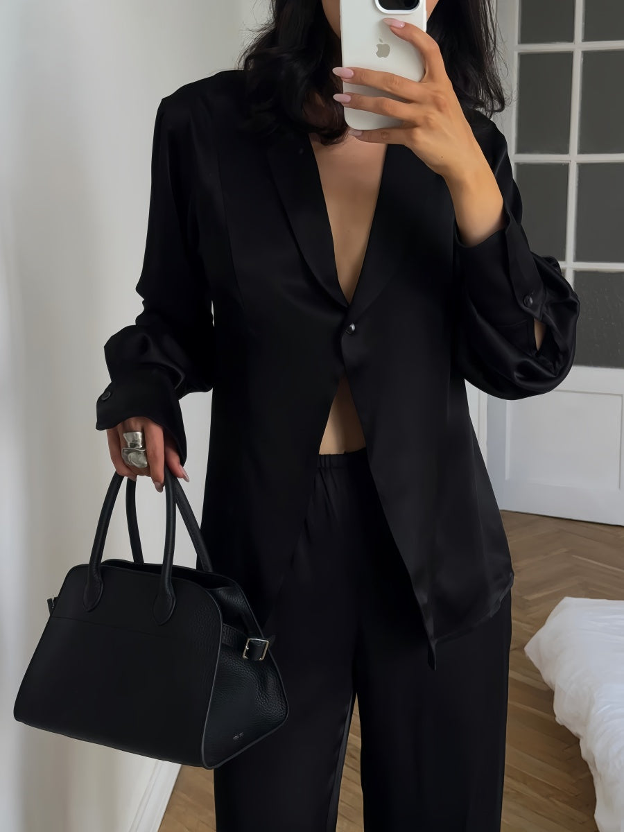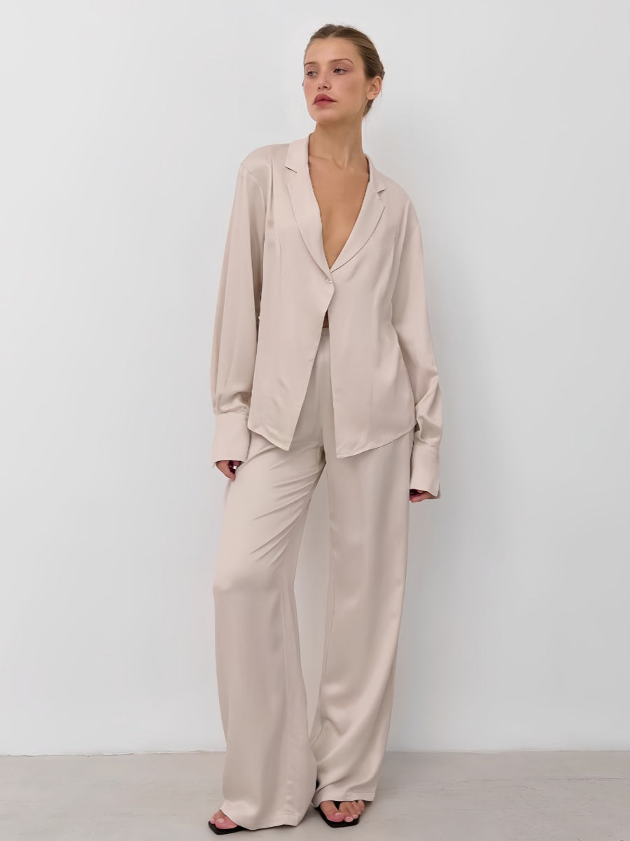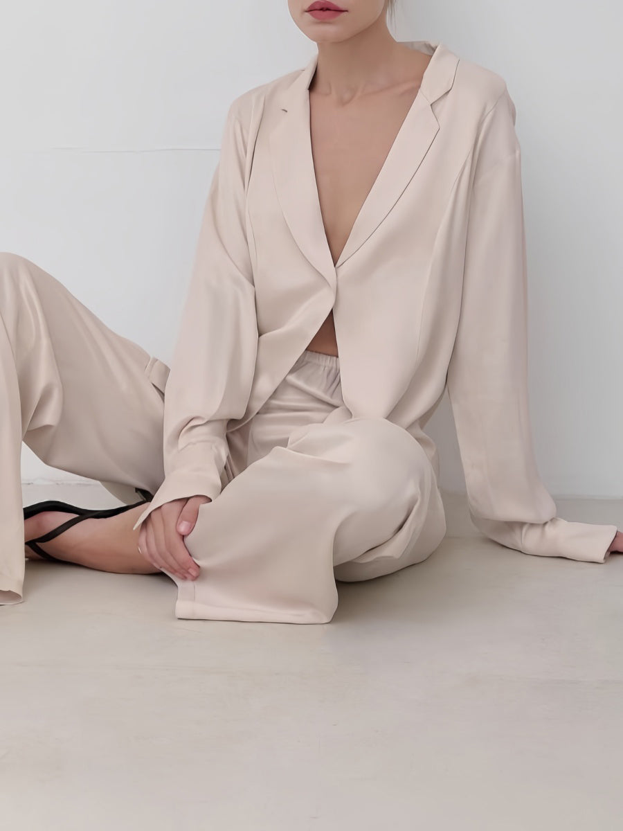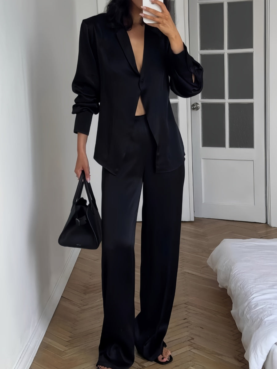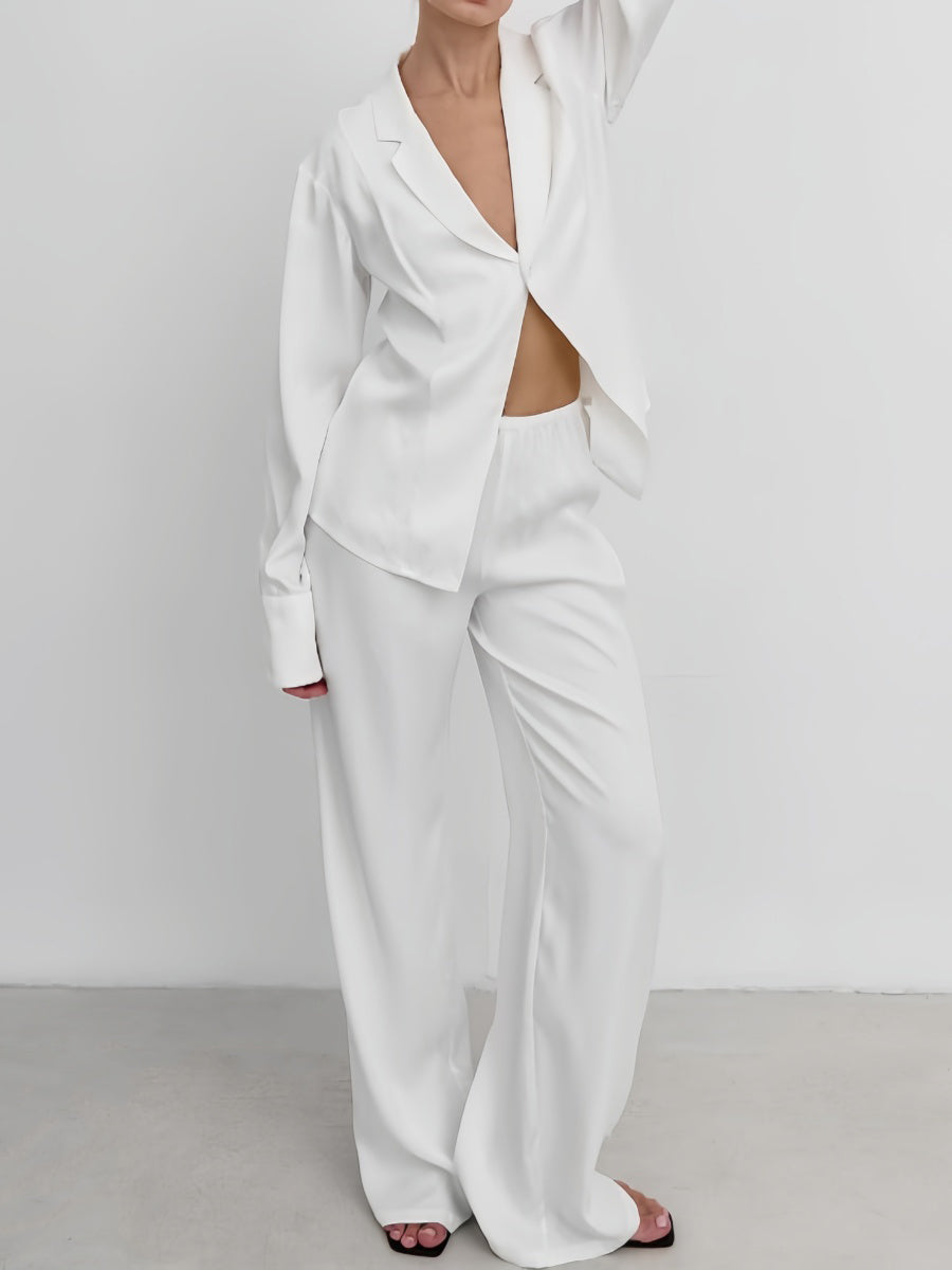 Elevate your wardrobe with this Solid V Neck Wide Leg Pants Set, designed for effortless style and comfort. The flattering V-neck top pairs perfectly with wide-leg pants that offer a relaxed fit and graceful movement. Combines modern elegance with all-day wearability.