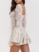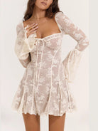 Elegant Lace Bell-Sleeve Mini Dress: Delicate lace fabric meets dramatic bell sleeves for a romantic and feminine silhouette. The mini length adds a modern, playful touch, making it perfect for date nights, parties, or special occasions where you want to feel effortlessly chic.